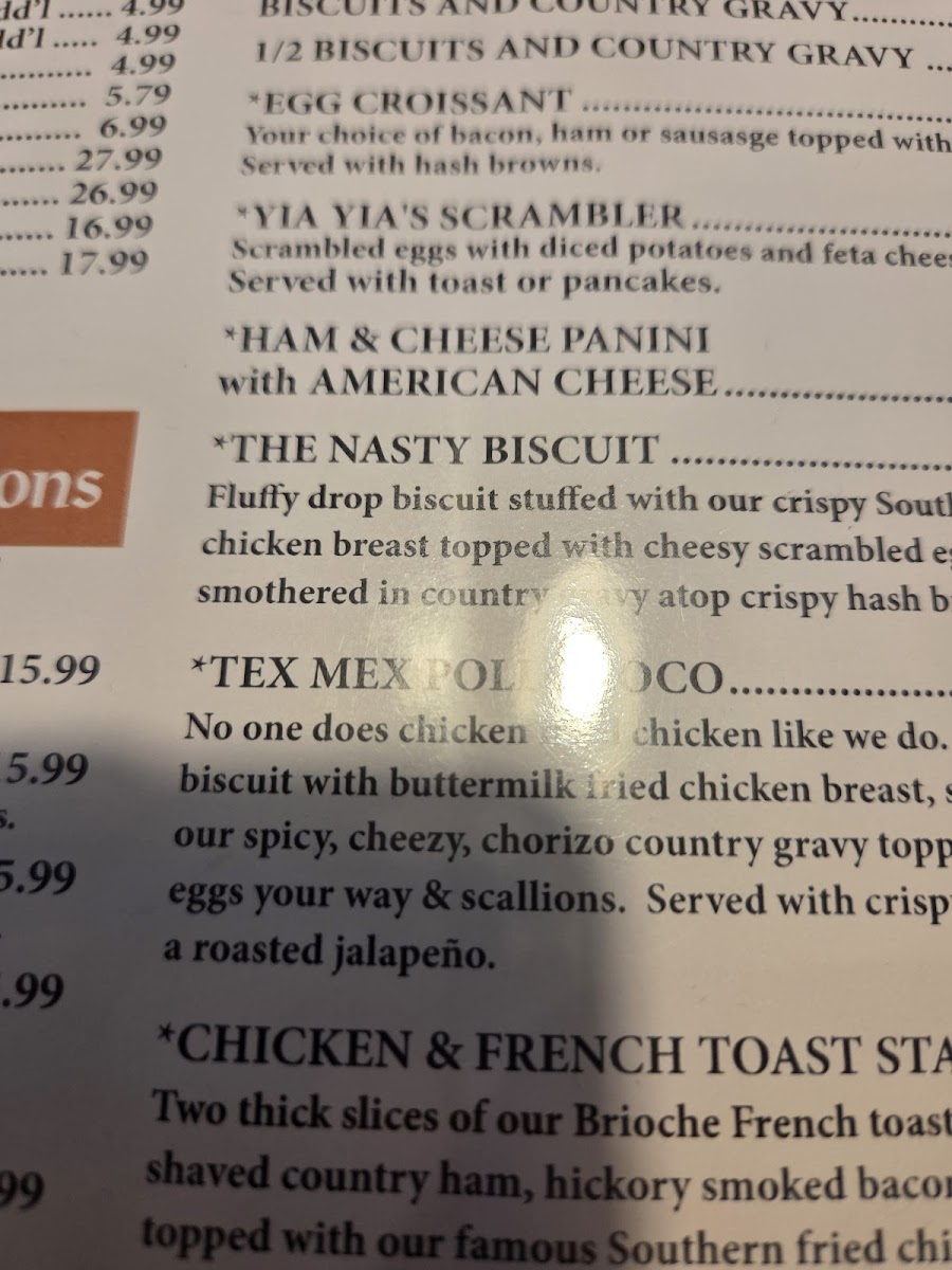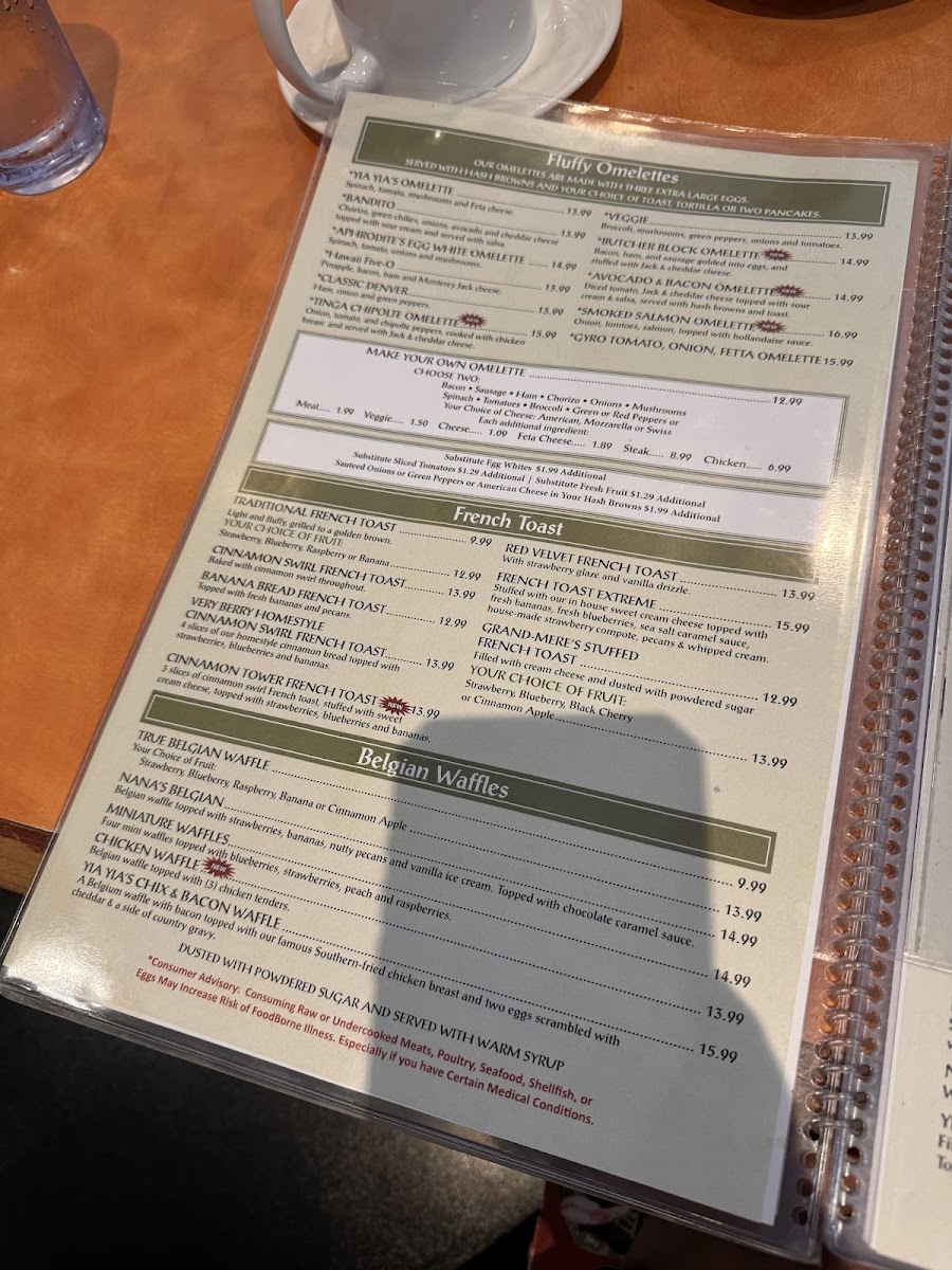 3 thick slices of greek french toast soaked in vanilla infused buttermilk batter. one layer stuffed with country ham and cheese , the other stuffed with bacon and cheese then drizzled with warm maple syrup topped with 2 cheesey scrambled eggs.